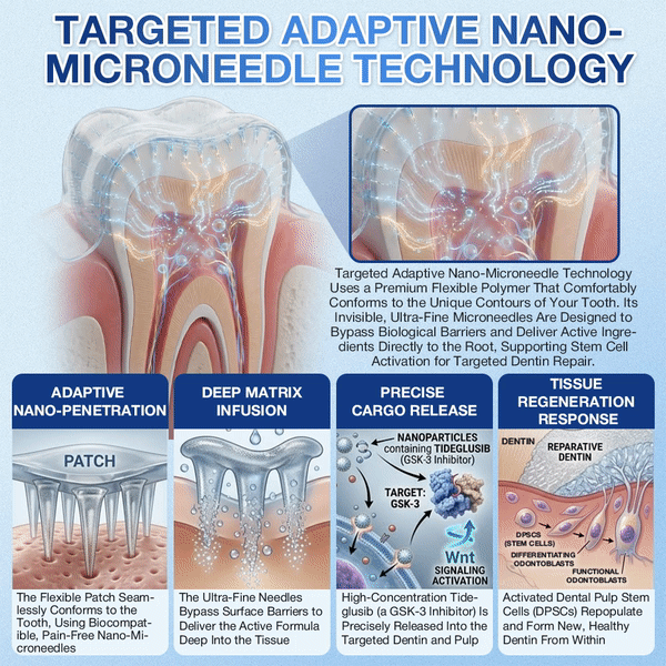 Utilizing advanced Adaptive Nano-Microneedle Technology, this approach enables the biological reprogramming of damaged tooth tissues. Through a nanoscale microneedle array, the patch penetrates biological barriers that conventional agents struggle to reach, delivering a high concentration of the GSK-3 inhibitor (Tideglusib) directly and precisely to deep dentin lesions. Once localized, the compound rapidly releases the inhibitory control of GSK-3 over cellular regeneration signaling, thereby strongly activating the previously dormant Wnt signaling pathway. This biological signal is then transmitted to dental pulp stem cells (DPSCs), inducing rapid proliferation and directed differentiation into odontoblast-like cells with reparative functions.